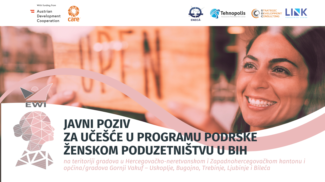 U okviru regionalnog projekta EWI – Ekonomska inkluzija i pravda za žene zapadnog Balkana, koji provodi CARE s partnerima iz četiri države: LINK Poduzetnički centar (Bosna i Hercegovina), SDC (Sjeverna Makedonija), ENECA (Srbija) i Tehnopolis (Crna Gora), raspisan je javni poziv za žene koje žele pokrenuti ili unaprijediti vlastiti biznis. Projekt financijski podržava Austrijska razvojna agencija.