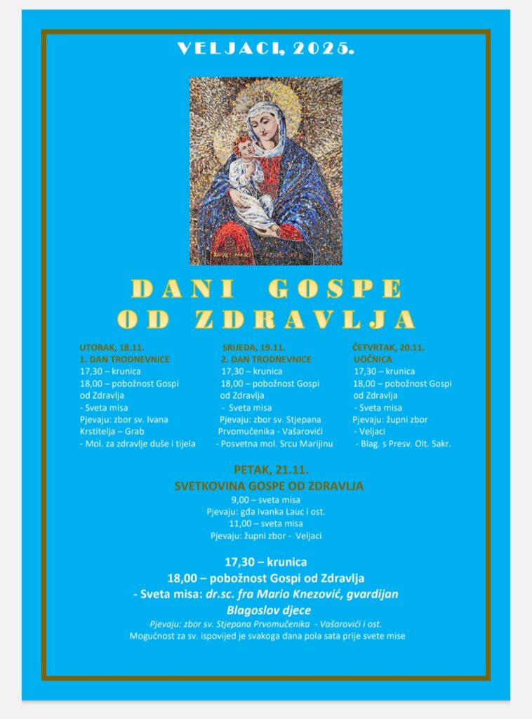 - 18:00 – pobožnost Gospi od Zdravlja i sv. misa